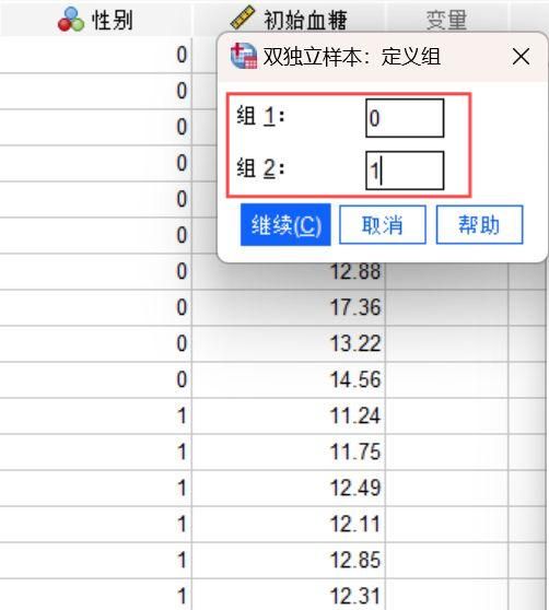 4、由于体检性别数值分别为0和1,所以我们在双独立样本的定义组别中参照了案例数据的数值信息,代表男性居民的组1输入数值为0,代表女性居民的组2输入数值为1。