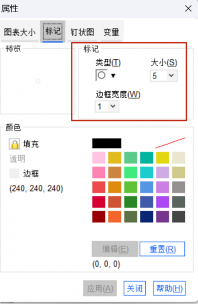 3、设置标记的属性,我们可以设置标记的形状、颜色和大小等等,此处我们选择圆形标记,完成后一定要点击“应用”按钮。