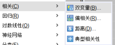 1、在软件中,点击顶部菜单栏【分析】选项,选择列表中的【相关】,找到其中的【双变量】。