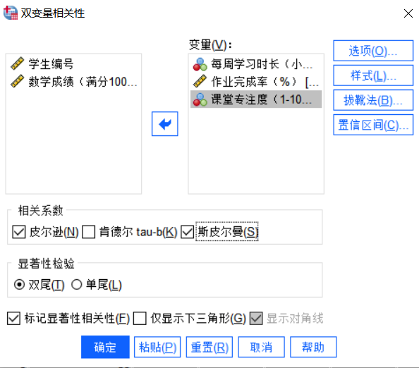 2、将每周学习时长、作业完成率、课堂专注度变量从左侧拖入右侧【变量】框,在相关系数类型中选择皮尔逊、斯皮尔曼,在显著性检验中勾选双尾;再勾选标记显著性相关性。