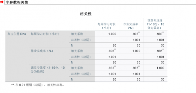 4、以下是斯皮尔曼相关性分析,根据相关矩阵显示,每周学习时长、作业完成率与课堂专注度三者间的两两相关系数分别为1.000、0.996以及0.983,我们能发现每周学习时长、作业完成率和课堂专注度这三个自变量,彼此之间的正相关关系特别强,相关系数都超过0.98,并且p值小于0.001,这说明它们不是互相独立的预测因素,而是高度绑定在一起的。