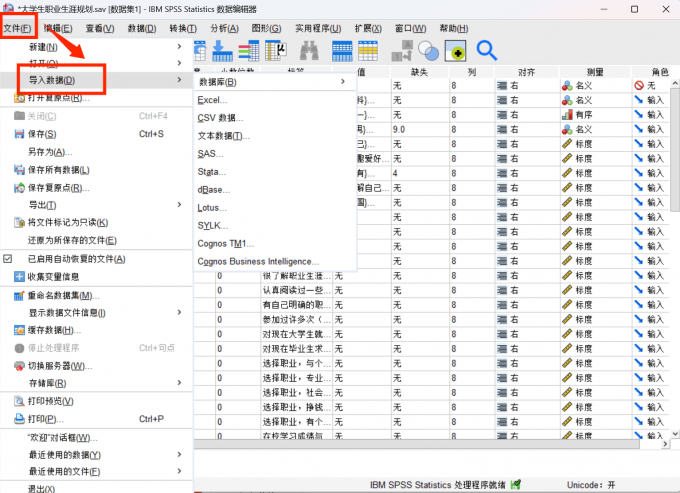 1、打开SPSS数据分析软件进入到【数据视图】界面,在初始界面中打开需要设置数据变量类型的样本。在界面左上角的【文件】选项中打开【导入数据】,就可以把数据样本在SPSS中打开。